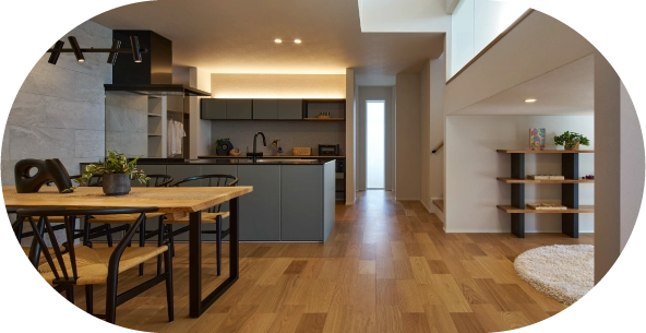 アイ工務店が実現する未来を見据えた安心と快適。アイ工務店ではあらゆる可能性を考慮し高い断熱・気密性能や耐震、耐久、耐火性といったテクノロジーを追及。未来の安心も内包する家を実現しています。天井裏の木材や肺戦闘があってもしっかりと天井全体を断熱する屋根遮熱断熱。床下は湿気が溜まりやすく、基礎断熱&防湿フィルムを採用した床下断熱。優れた断熱性を発揮するN-ees+Sのダブル断熱工法の外壁。快適な室内環境を実現するLow-Eトリプルガラス採用の高性能断熱サッシなど